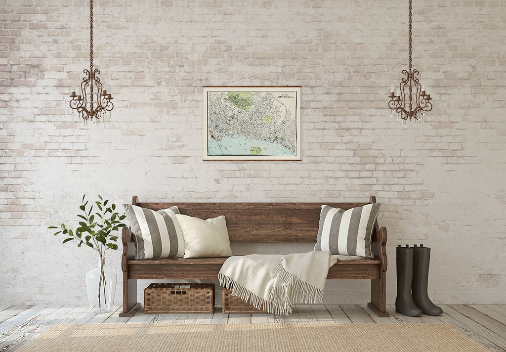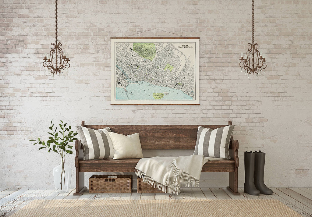 The Montreal map canvas is a handmade canvas map designed to bring vintage map decor and historical city map charm into your home. This large canvas map features an authentic antique style map of Montreal, providing a unique blend of art and education for your map home decoration needs. Crafted with museum quality canvas, this ready to hang map transforms any room with its detailed cartographic accuracy and timeless design.