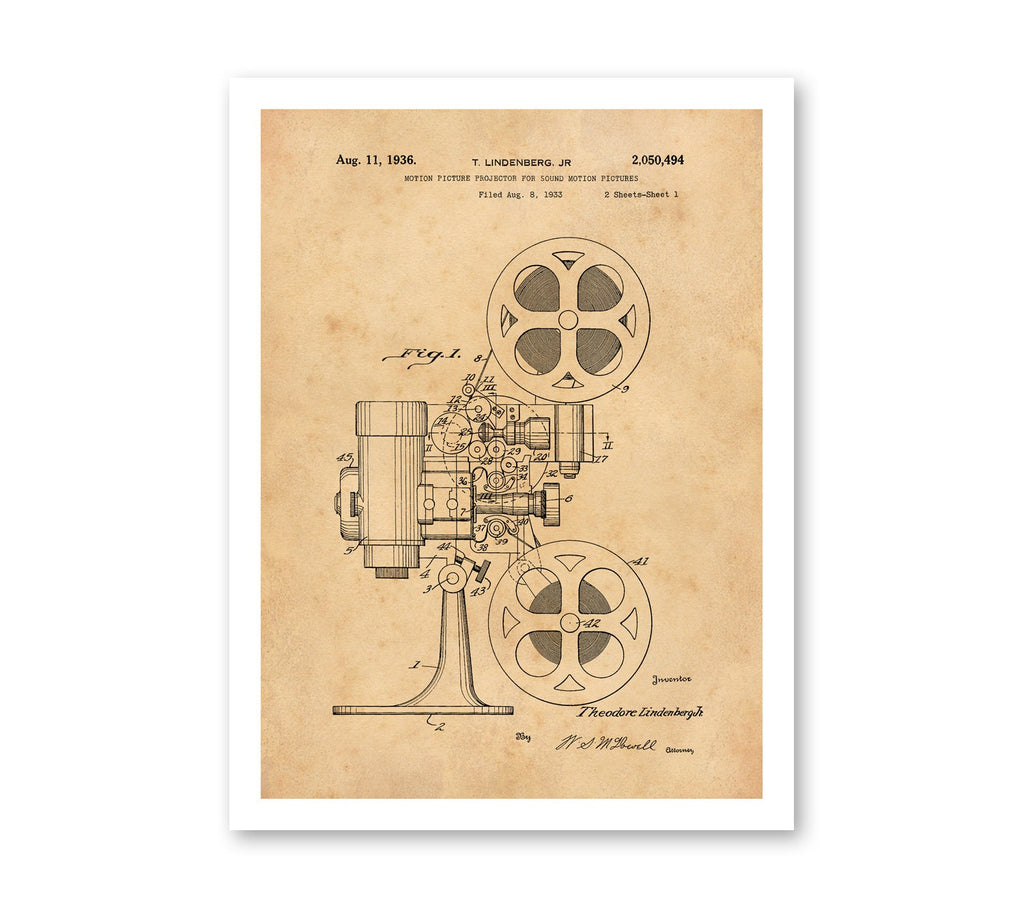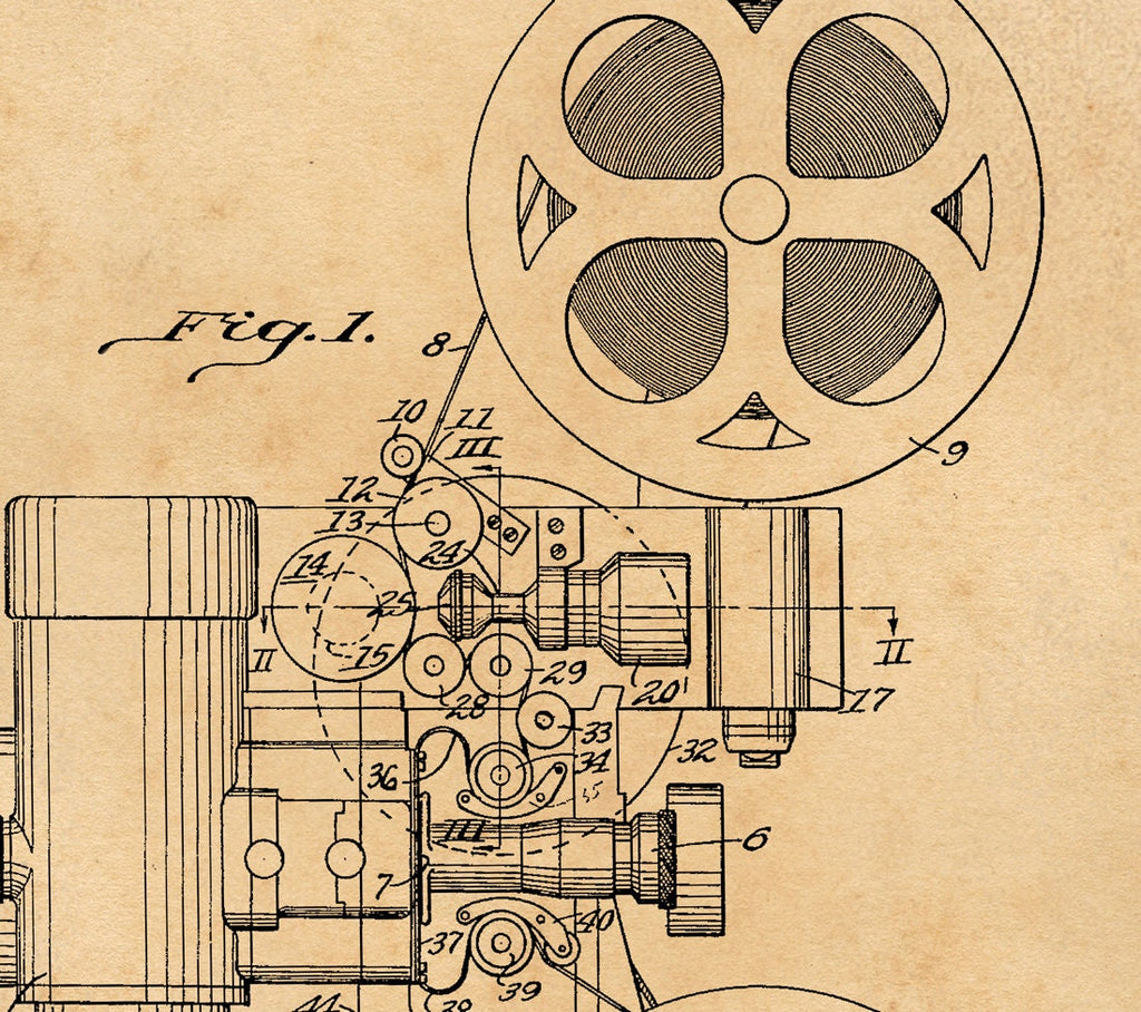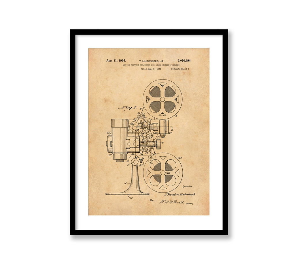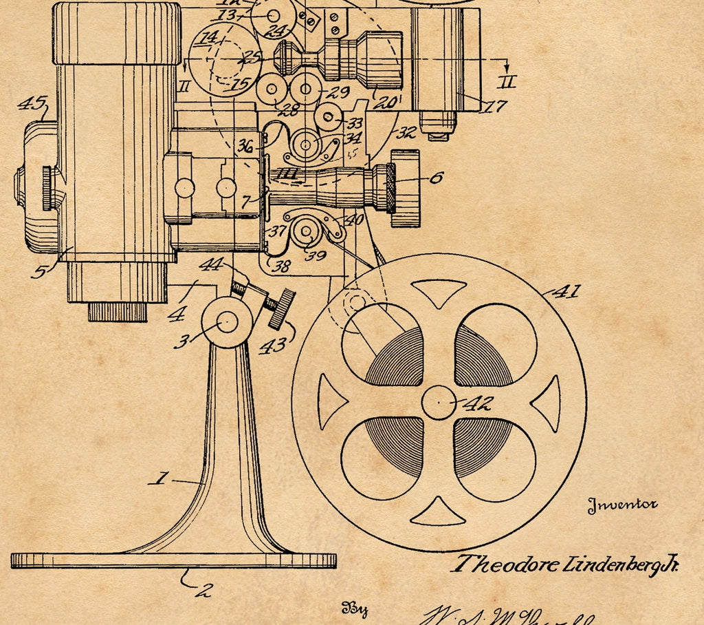 This motion picture projector vintage patent print brings industrial decor art to your space with a detailed film projector illustration that captures the essence of early cinema technology. Printed on heavyweight archival paper print, this restored vintage print offers a unique historical patent poster that serves as both a motion picture gift and a statement piece for rustic wall decor or shabby chic print lovers. Each patent artwork wall piece is carefully recreated from original designs and printed in large format poster sizes using a 12-color Canon Pro 4100 printer, ensuring vibrant colors and sharp detail.