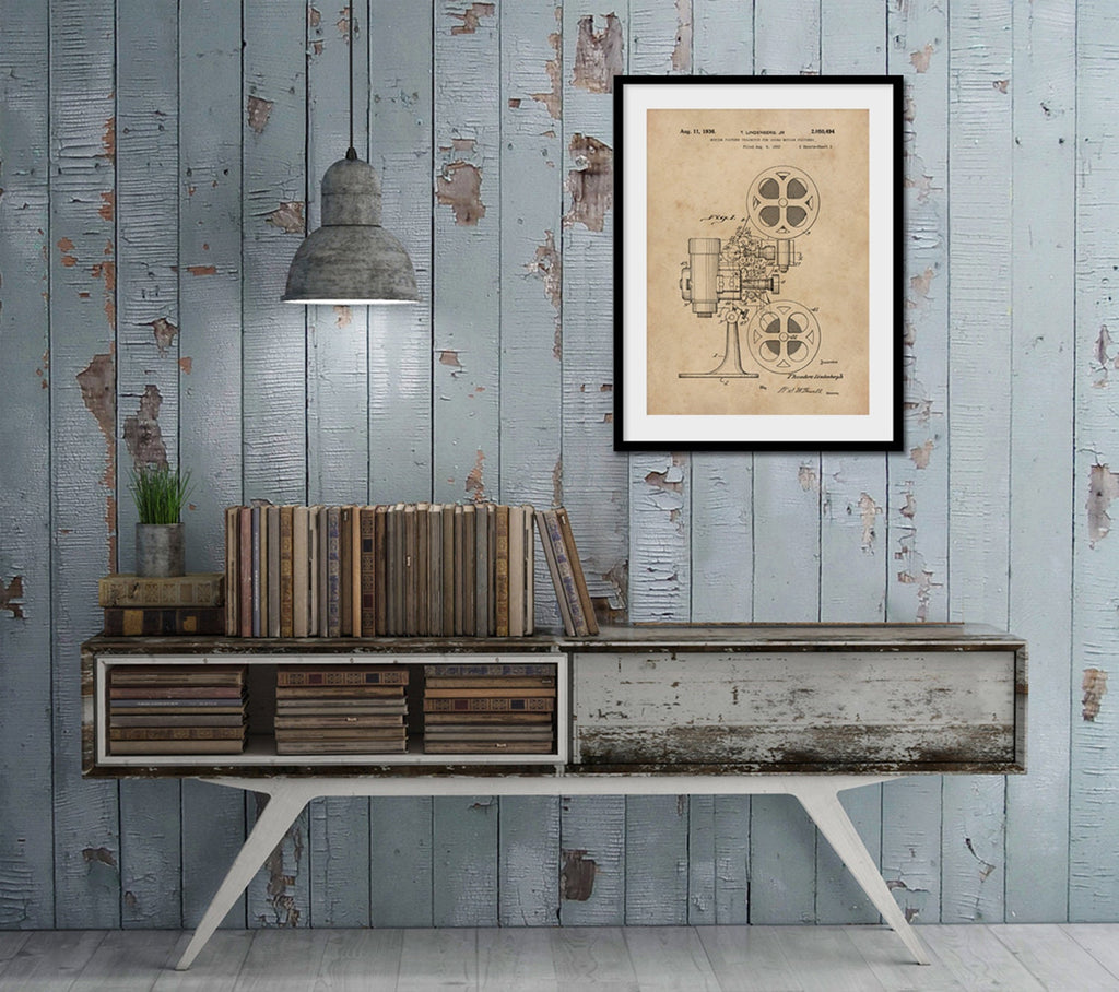Add this patent artwork wall print to your collection for a shabby chic print that complements rustic wall decor themes or as a standout large format poster in any room. Its blend of history and design makes it an excellent filmmaker gift idea or conversation starter for guests who appreciate vintage technology. Enjoy the charm of classic cinema with this beautifully restored vintage print that honors the original motion picture projector invention.